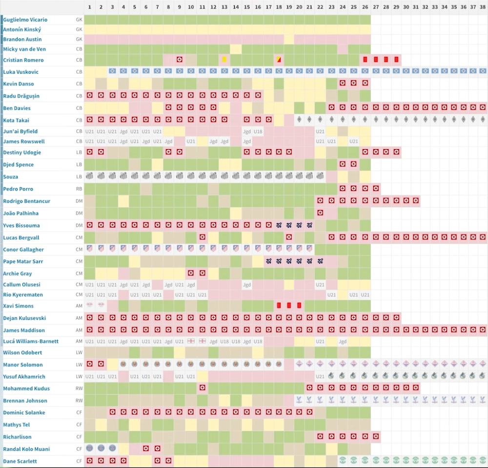 Tudorov roster je znatno oštećen. Od osmorice nabrojanih igrača, četvorica će mu biti nedostupna po dolasku. Romero mora odslužiti suspenziju od četiri utakmice, Maddisona nema do kraja sezone, Kuluševski je ozlijeđen još od svibnja prošle godine i pitanje je u kakvom stanju će se vratiti, a najnoviji na listi je i Porro. Kada se tu doda drugi bek Destiny Udogie, veznjak Rodrigo Bentancur, ponajbolji dribler lige Mohammed Kudus, mlada nada Lucas Bergvall i stoper Ben Davies, odjednom postaje jasno da Tudor radi s 'ostacima ostataka'.