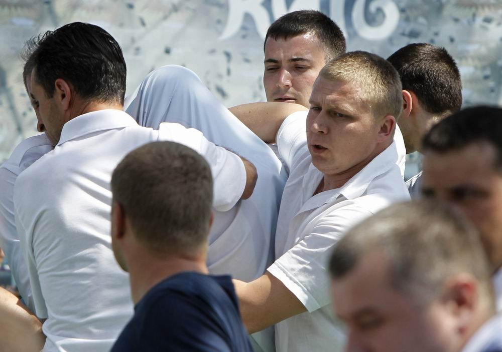 No, iznenada je skinula majicu i pokazala gole grudi preko kojih je bila ispisana poruka 'J... Euro 2012'. Prije no što ju je zaštitar prekrio dekom i odveo policajcima, uspjela je s obje ruke uhvatiti pehar.