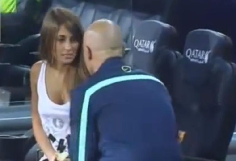 Antonella Rocuzzo obučena u majicu legendarnih australskih rokera ACDC-a zauzela je svoje mjesto uz travnjak kada joj je prišao Barcelonin trener vratara i zapodjenuo razgovor. U jednoj fazi malo ju je pomazio po obrazu i Španjolci su zaključili kako se ta gesta neće nimalo svidjeti najvećoj sportskoj zvijezdi svijeta.