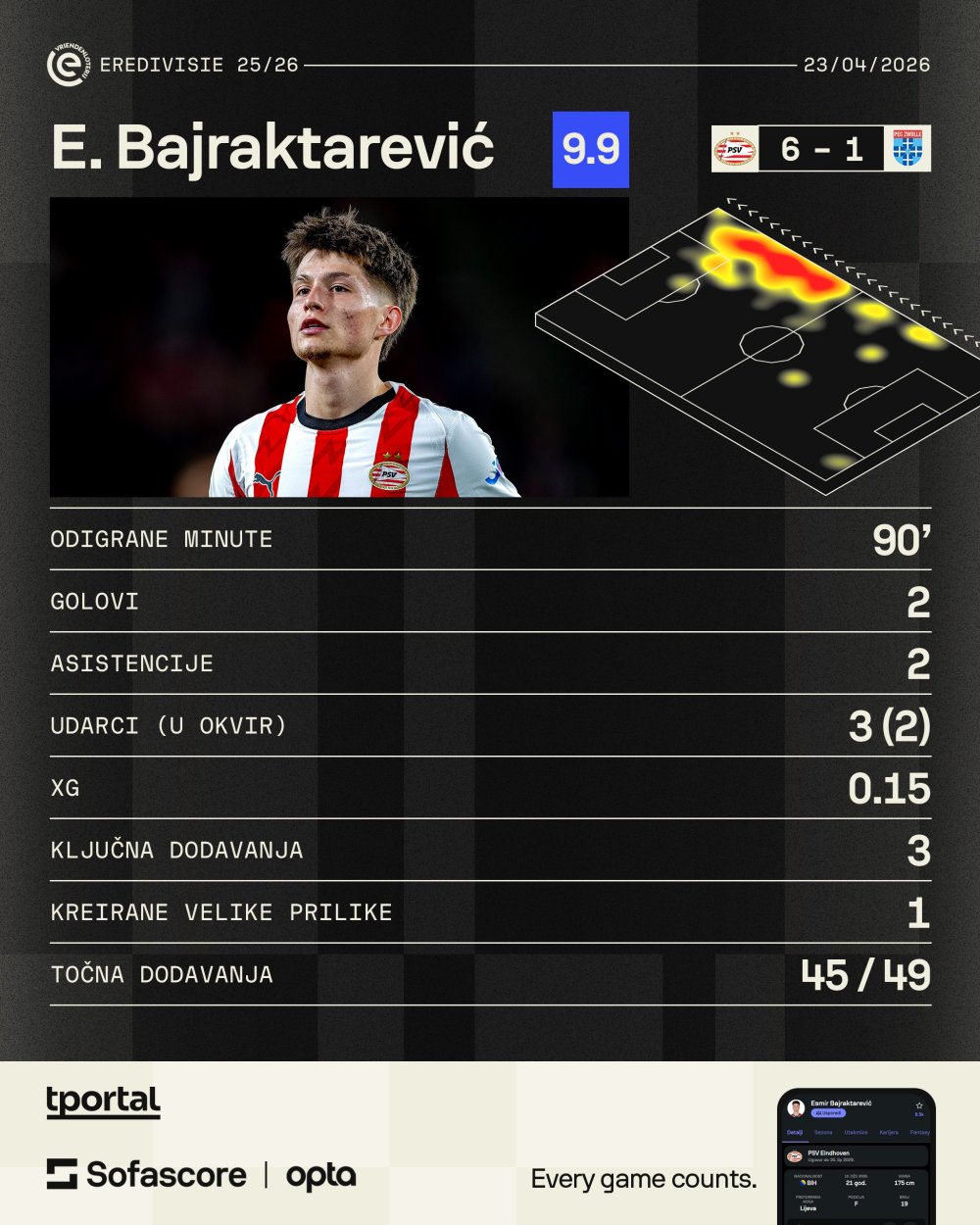 Ključnu ulogu u uvjerljivoj pobjedi PSV-a imao je reprezentativac Bosne i Hercegovine Esmir Bajraktarević. Napadač rođen u Sjedinjenim Američkim Državama najprije je dvaput asistirao Ricardu Pepiju, a potom sudjelovao i kod autogola Simona Gravesa.