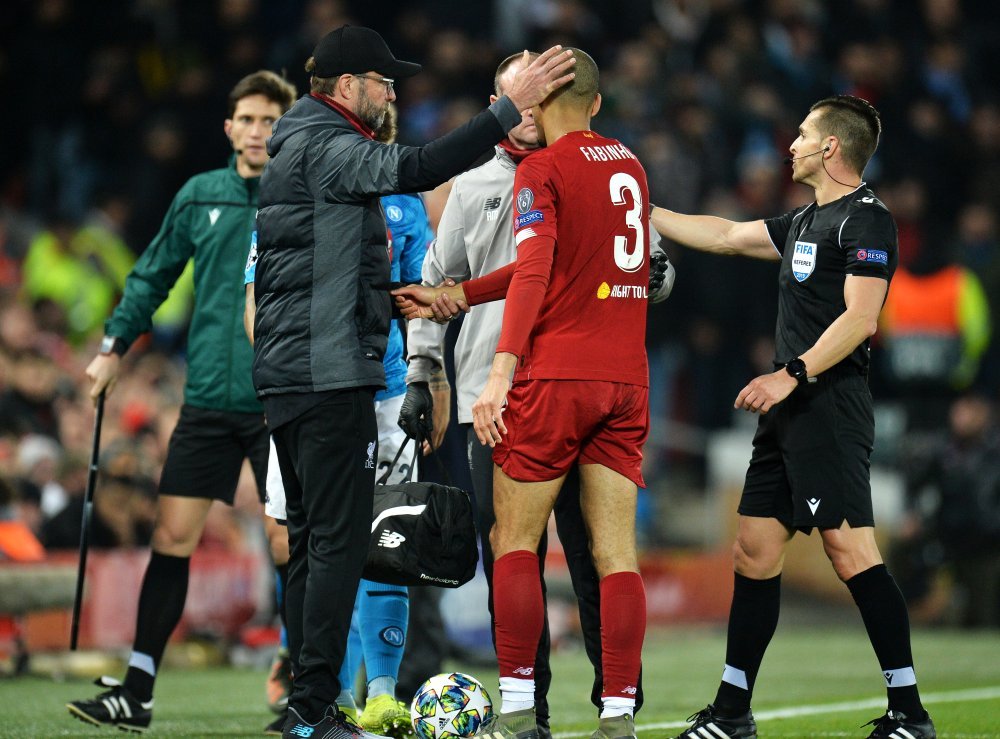 Fabinho je ozlijeđen u sudaru s krilom Napolija Hirvingom Lozanom nakon čega je šepajući napustio teren u 19. minuti kada ga je trener zamijenio Georginiom Wijnaldumom.
