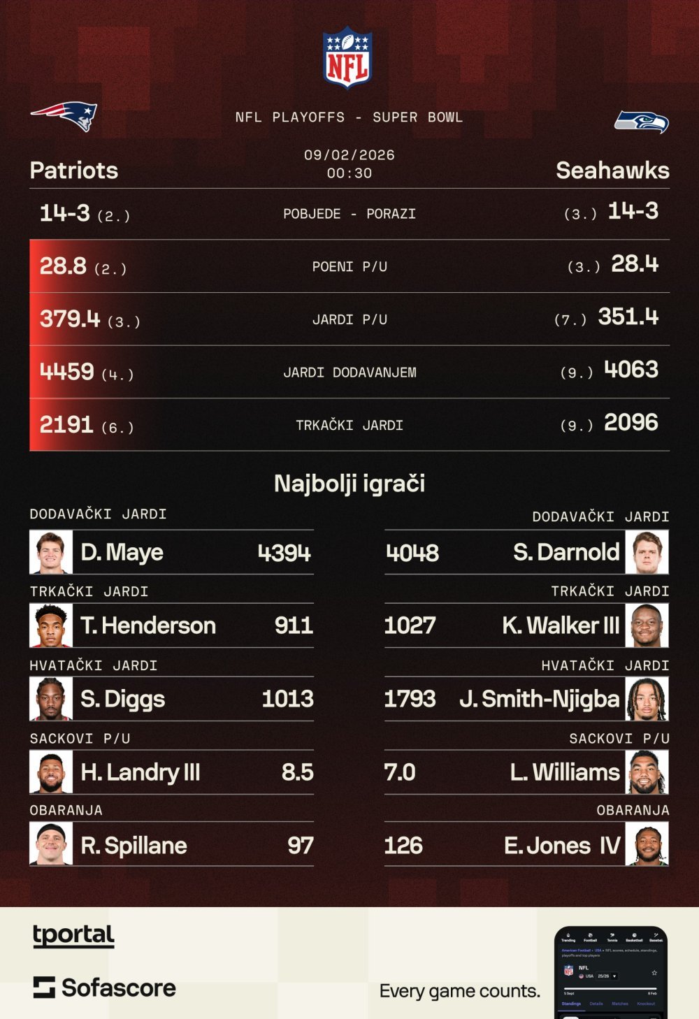Seahawksima, čije udarne igle su Sam Darnold, Jaxon Smith-Njigba, Leonard Williamson, Ernest Jones, iskusni Cooper Kupp, ovo je četvrta Super Bowl utakmica, a zadnji i jedini naslov im je onaj iz 2014. kada su u Super Bowl XLVIII doslovno uništili Denver Broncos 43-8. Sezonu nakon toga imali su priliku potvrditi naslov, ali su ostali za spomenuti 1 jard kratki baš protiv Patriotsa tako da večerašnji susret u koji Seahawski ulaze kao blagi favoriti ima prizvuk "revenge game-a". Tim više jer će i treneri Seahawksa, koji igraju odlično i bez oscilacija cijele sezone, Mike Macdonald i Klint Kubiak imati privatnu agendu budući da su ih treneri Patriotsa Mike Vrabel i Josh McDaniels pobijedili za NFL nagrade za trenere godine. Pritom bi Seattleu ekstra slatko bilo naslov osvojiti baš na stadionu njihovih divizijskih rivala San Francisco 49ersa.