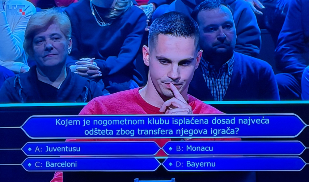 Postavljeno pitanje bilo je: Kojem je nogometnom klubu isplaćena dosad najveća odšteta zbog transfera njegova igrača? Ponuđeni odgovori bili su: Juventus, Monaco, Barcelona i Bayern.