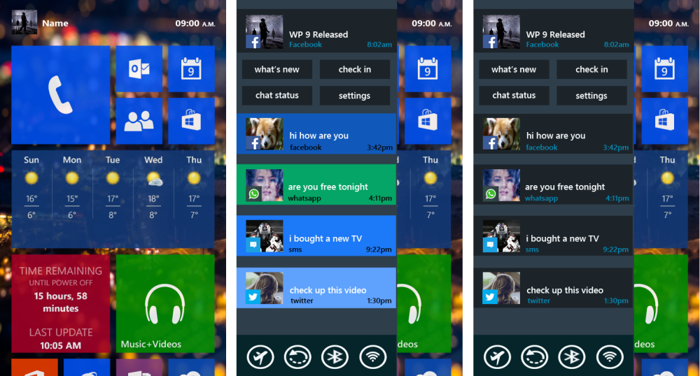 Windows Phone 8.1 kodnog imena 'Blue' bi se trebao pojaviti u sljedećih nekoliko mjeseci, a šuška se kako će uobičajene pločice i pozadinu u crnom ili bijelom zamijeniti i wallpaperi. To nije spriječilo jednog posjetitelja stranice Neowin u kreaciji vlastite vizije kako će izgledati sljedeća 'velika nadogradnja' - Windows Phone 9