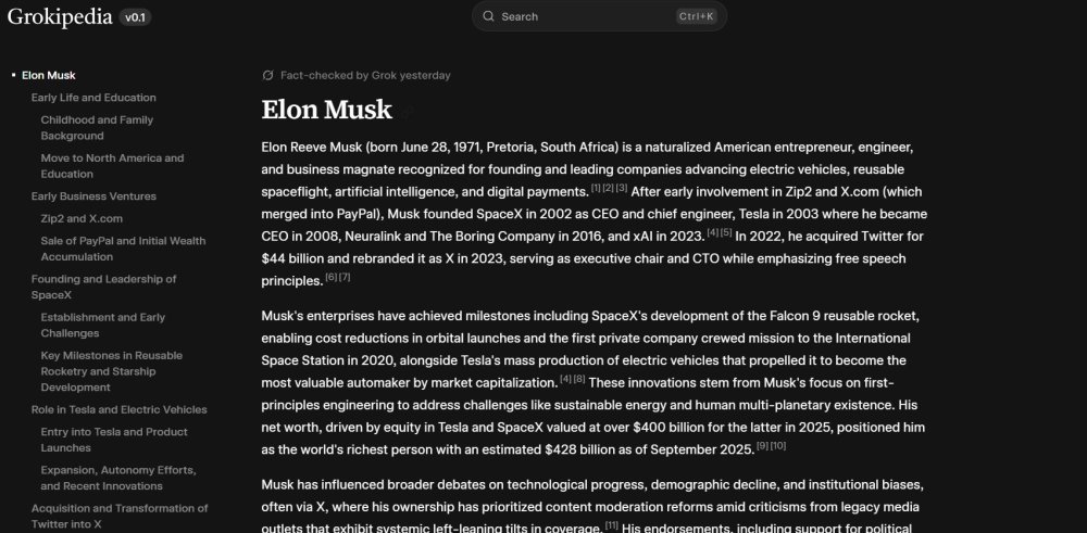 Elon Musk predstavio je Grokipediju, novu online enciklopediju koju opisuje kao alternativu Wikipediji. Prema njegovim riječima, na projektu je radio tim iz tvrtke xAI, a domena Grokipedia.com aktivna je od ponedjeljka. Sadržaj Grokipedije generira umjetna inteligencija (AI) i generativni AI asistent Grok, ali se na svakoj stranici navodi više izvora.