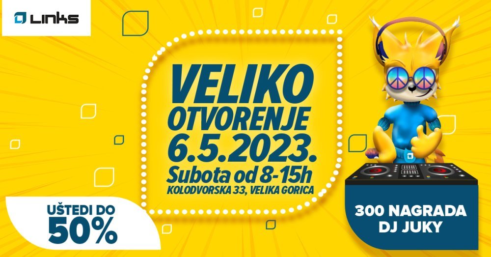 Ove subote 6.5.2023. od 8 sati održat će se veliko otvorenje Links poslovnice u Velikoj Gorici uz odlične uštede do 50% na 60 različitih artikala i uz osigurane količine preko 1.000 komada