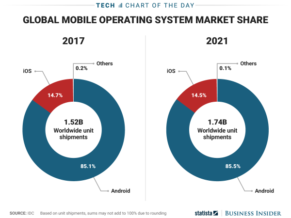 Mikro promjene u strukturi poput cijene prosječnog Androida će pasti do 2021. Sa polaganim usporavanjem prodaje smartfona, teško je zamisliti da će bilo koji veliki igrač pokušati konkurirati dobro utemeljenim standardima. Puno je, naime, lakše jednostavno napraviti nešto kompatibilno s Appleovim iOS-om ili Googleovim Androidom.