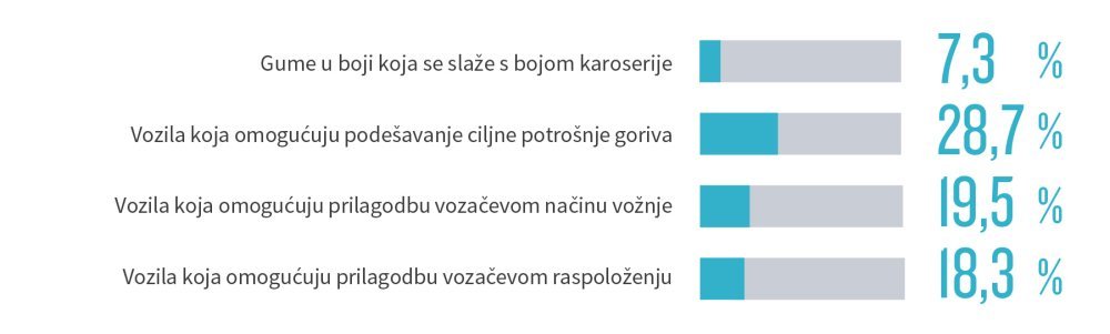 Na vrhu želja je funkcionalnost, a ne estetika: 28,7 posto ispitanih želi mogućnost prilagodbe individualnim ciljevima o potrošnji goriva, osobnom načinu vožnje (19,5 posto), pa čak i raspoloženju (18,3 posto).