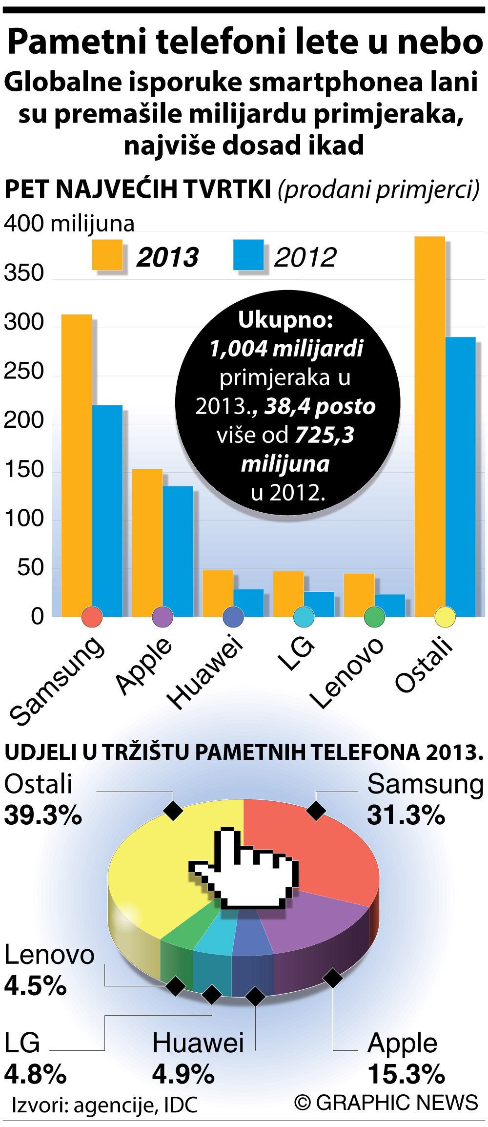Samsung je prošlu godinu završio kao neosporni predvodnik, sa 313,9 milijuna isporučenih pametnih telefona poput Galaxyja 3 i 4 te nekoliko modela iz serije Note. Imao je dvostruko više od drugoplasiranog Applea - Samsung je ugrabio 31,3 posto, a Apple (sa 153,4 milijuna uređaja) 15,3 posto tržišta.