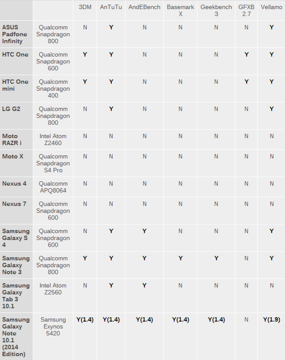 Društvo sa stranice Anandtech, nakon inicijalnih dojmova i dobivenih rezultata, odlučilo je složiti kompletnu tablicu s testovima i označiti koji su uređaji varali na njima - i što je važnije - gdje točno: