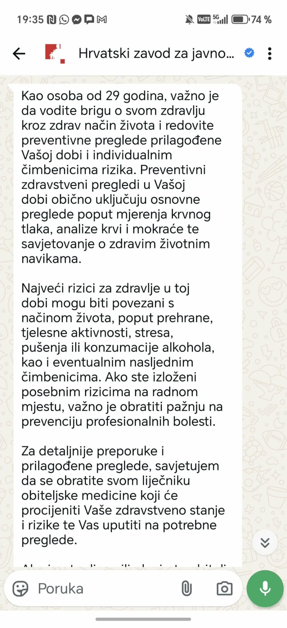 Ako ste izloženi posebnim rizicima na radnom mjestu, važno je obratiti pažnju na prevenciju profesionalnih bolesti. Ako imate djecu ili planirate obitelj, važno je znati da za djecu postoje posebni preventivni programi poput Nacionalnog programa ranog otkrivanja slabovidnosti i Zubne putovnice, koji pomažu u očuvanju zdravlja Vaše djece', naveo je ZdrAVKO, odmah dajući savjete i o tome da u mladosti možemo razmišljati o zdravlju budućih potomaka.
