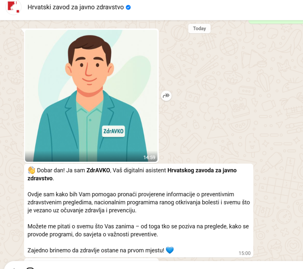 AI digitalni zdravstveni asistent pokrenut je ovog tjedna na WhatsAppu i prvu večer bio je srušen upitima. Nakon oporavka sjajno odgovara na pitanja o preventivnim programima HZJZ-a, primjerice kada se javiti liječniku, a kada neke stvari možete sami provjeriti. ZdrAVKO je sposoban razumjeti složena pitanja, ali još nije dobio sve informacije koje HZJZ ima na svojim stranicama te, odgovarajući na pitanja o najčešćim bolestima, neće otkrivati tko je najbolji liječnik za pojedinu od njih