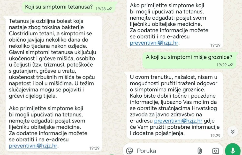 'U ovom trenutku, nažalost, nisam u mogućnosti pružiti traženi odgovor o simptomima mišje groznice. Kako biste dobili točne i pouzdane informacije, ljubazno Vas molim da se obratite stručnjacima Hrvatskog zavoda za javno zdravstvo na e-adresu preventivni@hzjz.hr, gdje će Vam pružiti potrebne informacije i dodatna pojašnjenja (...). Tetanus je ozbiljna bolest koja nastaje zbog toksina bakterije Clostridium tetani, a simptomi se obično javljaju nekoliko dana do nekoliko tjedana nakon ozljede.