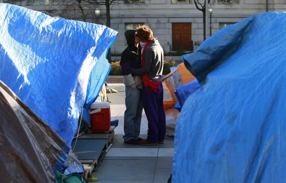 U sinoćnjoj akciji pred elitnim hotelom u Washington D.C.-ju, gdje se na svečanosti zatvorenog tipa i gala večeri AlfaAlfa kluba našao i predsjednički bračni par Obama, 200-ak prosvjednika protiv korporacijske pohlepe razgolitilo je torza u znak prosvjeda protiv uklanjanja šatora na trgovima McPherson i Freedom Plaza nedaleko od Bijele kuće. Na grudima jedne prosvjednice pisalo je 'Sloboda izražavanja'.