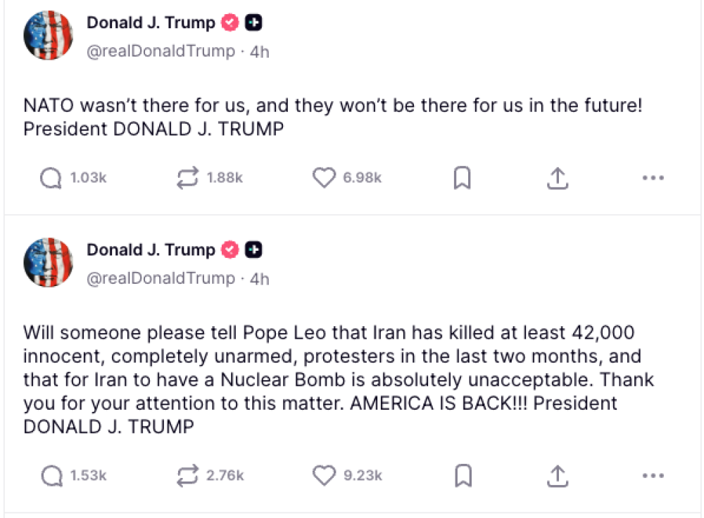 Američki predsjednik obnovio je kritike na račun Pape, napisavši tijekom noći na društvenim mrežama da bi netko trebao reći Papi Leu kako je Iranu u posljednja dva mjeseca ubio najmanje 42.000 nenaoružanih prosvjednika te da je posjedovanje nuklearnog oružja za Iran “apsolutno neprihvatljivo”. Trump je poruku zaključio riječima: “Hvala na pažnji. AMERIKA SE VRATILA!!!”