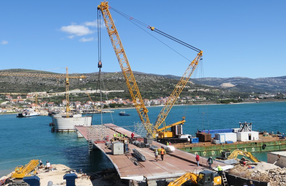 Ovog četvrtka dočekala nas je neumoljiva kiša i većina aktivnosti odvijala se iza zatvorenih vrata, na sastancima koordinacije s kojih su se iza zatvorenih vrata povremeno probijali povišeni tonovi. U petak je bilo znatno ljepše vrijeme, pa je i slika bila znatno optimističnija: morske dizalice krenule su montirati 40 metarske čelične segmente mosta, u idućim tjednima preostalo je dovući ih i postaviti još točno osam komada. Upravo nedavno u splitskom škveru uvjerili smo se da se oni režu, sklapaju, vare i bruse doslovno danonoćno.
