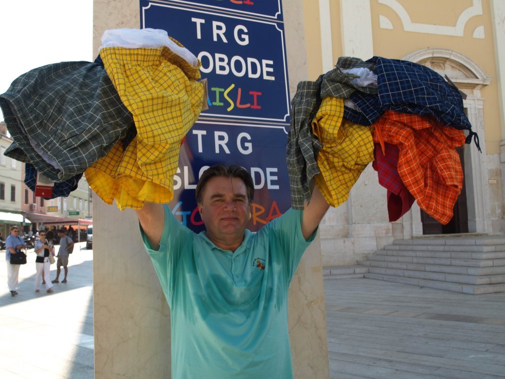 Popularni Nino, kao pravi trgovac, postavio je na glavnom porečkom trgu štand s muškim boksericama svih boja i veličina. U desetak minuta podijelio je stotinjak komada unikatnih gaća. Naime, svaki komad potpisao je zlatnim flomasterom, a posebnu čast iskazao je kolegama s Jutarnjeg i Večernjeg lista, namijenivši prve ekskluzivne mudante s županovim potpisom Milanu Ivkošiću, kojem je u kovertu stavio i naljepnicu 'Trg slobode – riječi', potom je, kako je kazao, sljedeću pošiljku zaslužila i Patricija Kiš koja je dobila naljepnicu 'Trg slobode – misli', dok je u kovertu za Nadju Irenu Fišić uz bokserice priložio i naljepnicu 'Trg slobode – govora'.