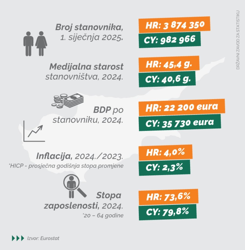 Naseljen još od brončanog doba, Cipar ima dugu i burnu povijest. Na raskrižju kultura, nekoć pod snažnim utjecajem stare Grčke, Rima i Osmanskog Carstva, Cipar je proglasio svoju neovisnost od Velike Britanije 1960., a 44 godine poslije, točnije 1. svibnja 2004., postaje članica Europske unije. Prvog dana 2026. preuzeo je predsjedanje Vijećem EU-a, a tu će dužnost obavljati do kraja lipnja 2026., podsjeća u svom tekstu Državni zavod za statistiku.
