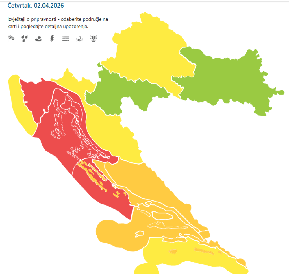 Izdali su narančasto upozorenje za Kninsku, Splitsku i Dubrovačku regiju te za Srednju Dalmaciju, jer vrijeme opasno zbog jakog vjetra. Za petak izdano je crveno upozorenje za Velebitski kanal, a narančasto za Riječku regiju te za Kvarner i Kvarnerić.