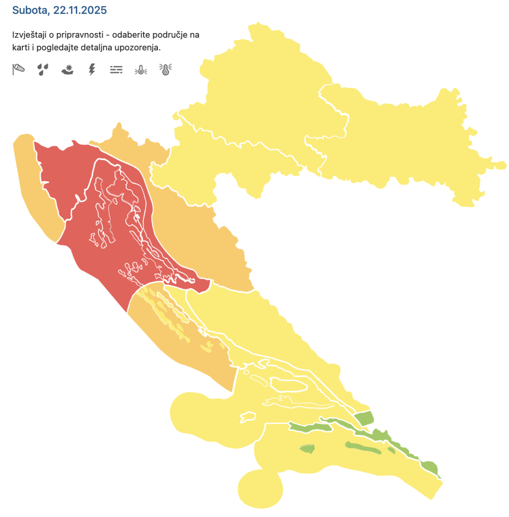 "Olujna bura, podno Velebita s orkanskim udarima. Najjači udari vjetra > 120 km/h. PODUZMITE MJERE za samozaštitu. Postoji rizik za osobnu sigurnost zbog iščupanih stabala, polomljenih grana te letećih krhotina. Očekuju se rasprostranjena oštećenja konstrukcija, prekid prometa i prekid opskrbe energijom."