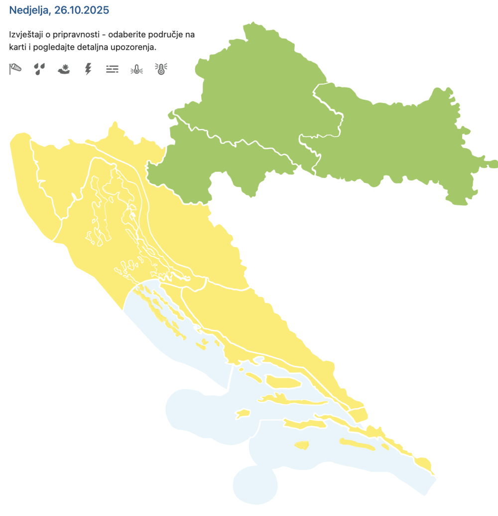 DHMZ je upozorio da su lokalno mogući izraženiji pljuskovi s grmljavinom. "Budite na oprezu zbog mogućih jačih grmljavinskih nevremena. Posebno pripazite u izloženim područjima kao što su planine, šume i livade odnosno otvoreni tereni. Mogući su prekidi u aktivnostima na otvorenom", javljaju meteorolozi.