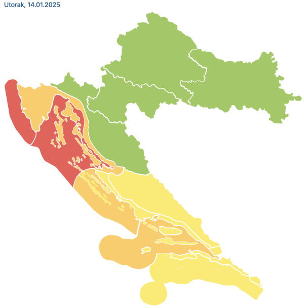Crveni meteoalarm vrijedi za područje Istre, Kvarnera i Velebitskog kanala. Očekuju se orkanski naleti bure brzine i do 165 km/h. Narančastim meteoalarmom označeno je područje riječko te područje Sjeverne i Srednje Dalmacije.