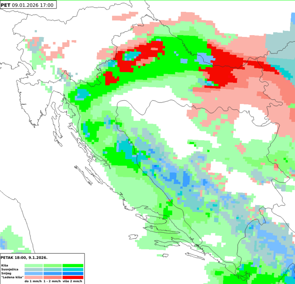 No u unutrašnjosti će u prizemnom sloju atmosfere i dalje biti prisutan hladan zrak, pa će se stvoriti povoljni uvjeti za mješovitu zimsku oborinu, odnosno oborinu na granici kiše i snijega.