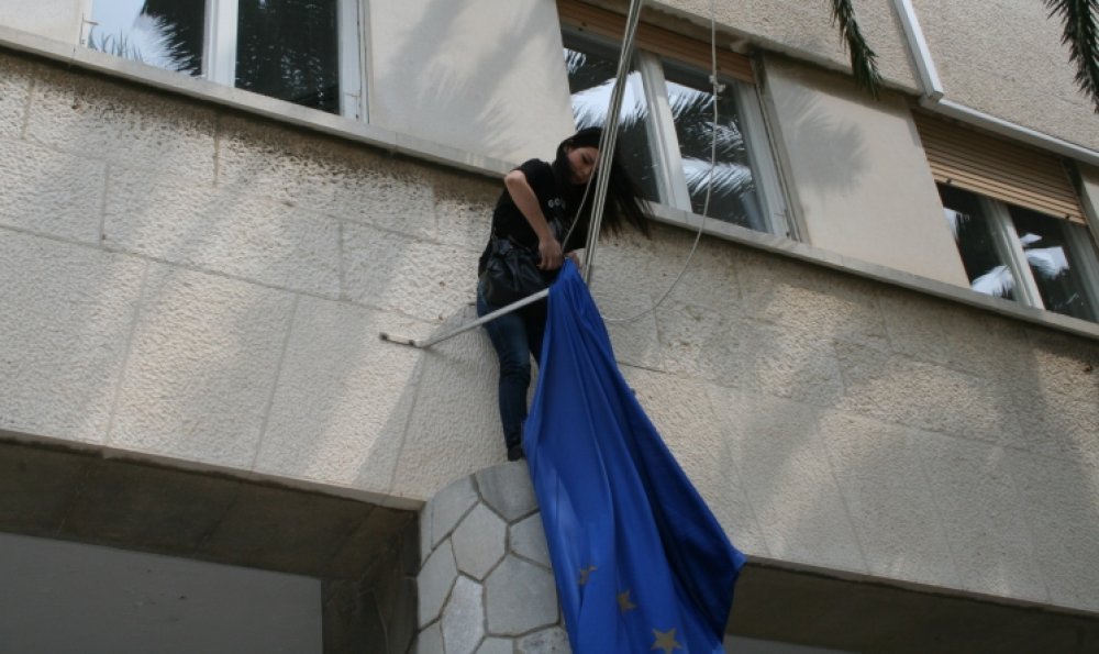 Kristina Ćurković, 20-godišnja tajnica udruge Volim Hrvatsku - ne u EU, izazvala je pravi metež pred zgradom splitske gradske uprave: nešto nakon podneva, odjevena u crnu majicu s likom generala Ante Gotovine, pojavila se ondje s ljestvama, popela se do barjaka i skinula obješenu zastavu Europske unije. Umjesto nje, okačila je hrvatsku zastavu