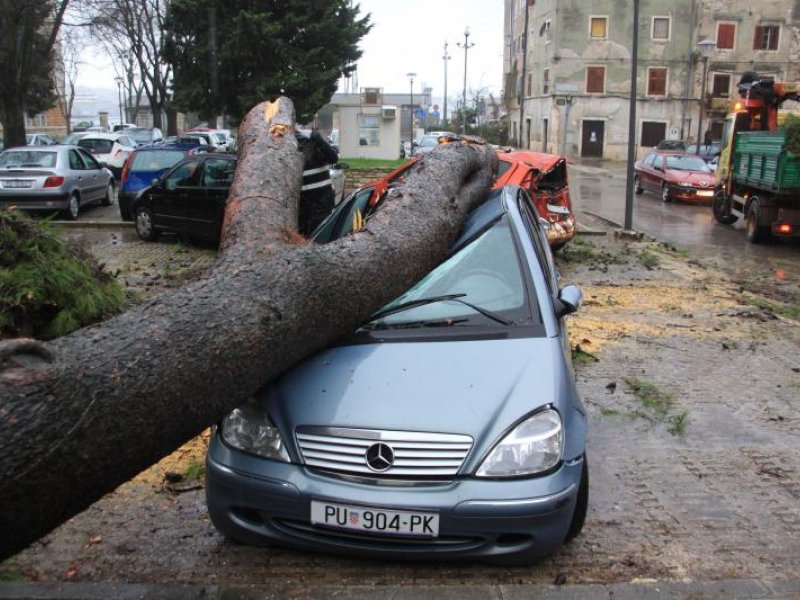 U Puli se noćas zbog jake kiše i vlažnog tla srušio 12-metarski bor promjera oko 70 centimetara pri čemu je oštetio šest vozila na parkingu Stara tržnica preko puta pisarnice