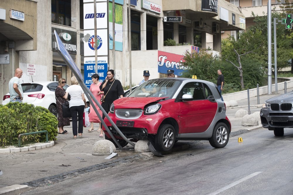 Kako je nesreću opisao fotoreporter agencije Cropix, vozilo marke Smart zabilo se u prometni znak u splitskoj Dubrovačkoj ulici zbog skliskog kolinka i neprilagođene brzine.