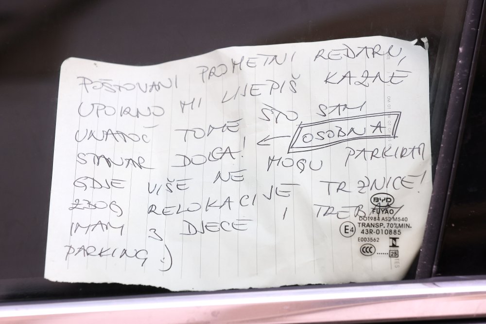 'Poštovani prometni redaru, uporno mi lijepiš kazne unatoč tome što sam stanar Dolca! Gdje više ne mogu parkirati zbog relokacije tržnice! Imam troje djece i trebam parking', napisao je građanin na papiriću.
