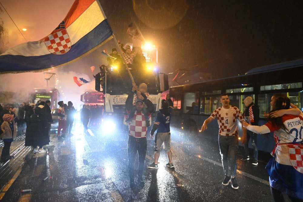 Spontanim zagrljajima, ponekom bakljom, mašući hrvatskim zastavama i navijačkim rekvizitima. Građanima, izgleda, ne smeta lagana kiša i relativna hladnoća.