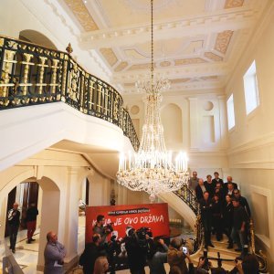 Konferencija za medije povodom predstavljanja filma Vinka Brešana 'Koja je ovo država' održana u Kulmerovim dvorima bila je dosad jedinstvena prilika novinarima i fotografima da se uvjere u raskoš salona obitelji Todorić