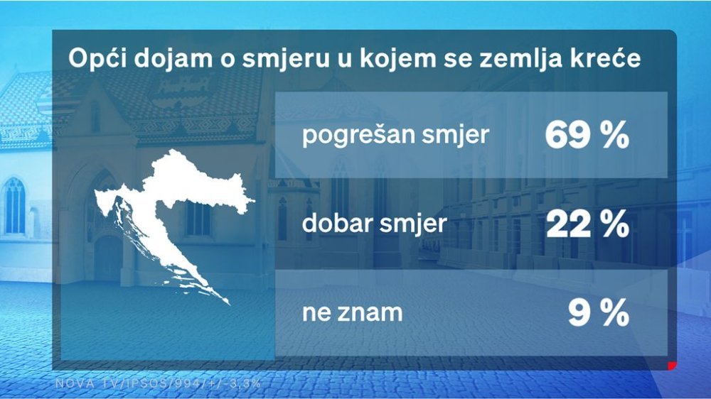 Kada se u obzir uzmu ovi problemi, ne čudi što čak 69 posto ispitanika ističe da zemlja ide u krivom smjeru. Da ide u dobrom smjeru smatra njih 22 posto, a 9 posto ispitanika nije se izjasnilo.