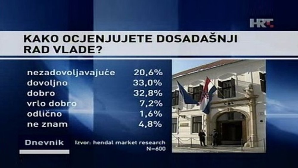Ocjenjujući rad Vlade na ljestvici od 1 do 5, čak 20,6 posto ispitanika Vladi je dalo nezadovoljavajuću ocjenu (1), a njih 33 posto dalo je prolaznu ocjenu dovoljan (2). Gotovo isto toliko ispitanika misli da Vlada radi dobro (3), samo 7,2 posto vrlo dobro (4), a tek 1,6 posto ispitanih građana misli da Vlada zaslužuje najvišu ocjenu (5), izvještava hrt.hr