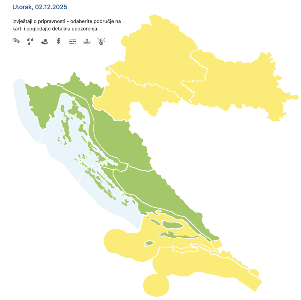 Utorak će u većem dijelu zemlje biti oblačniji dan, uz jačanje juga i povremenu kišu, ponajprije na Jadranu i uz obalu, gdje su mogući i pljuskovi s grmljavinom. Na kopnu će jutro početi s mjestimičnom maglom, javlja HRT.