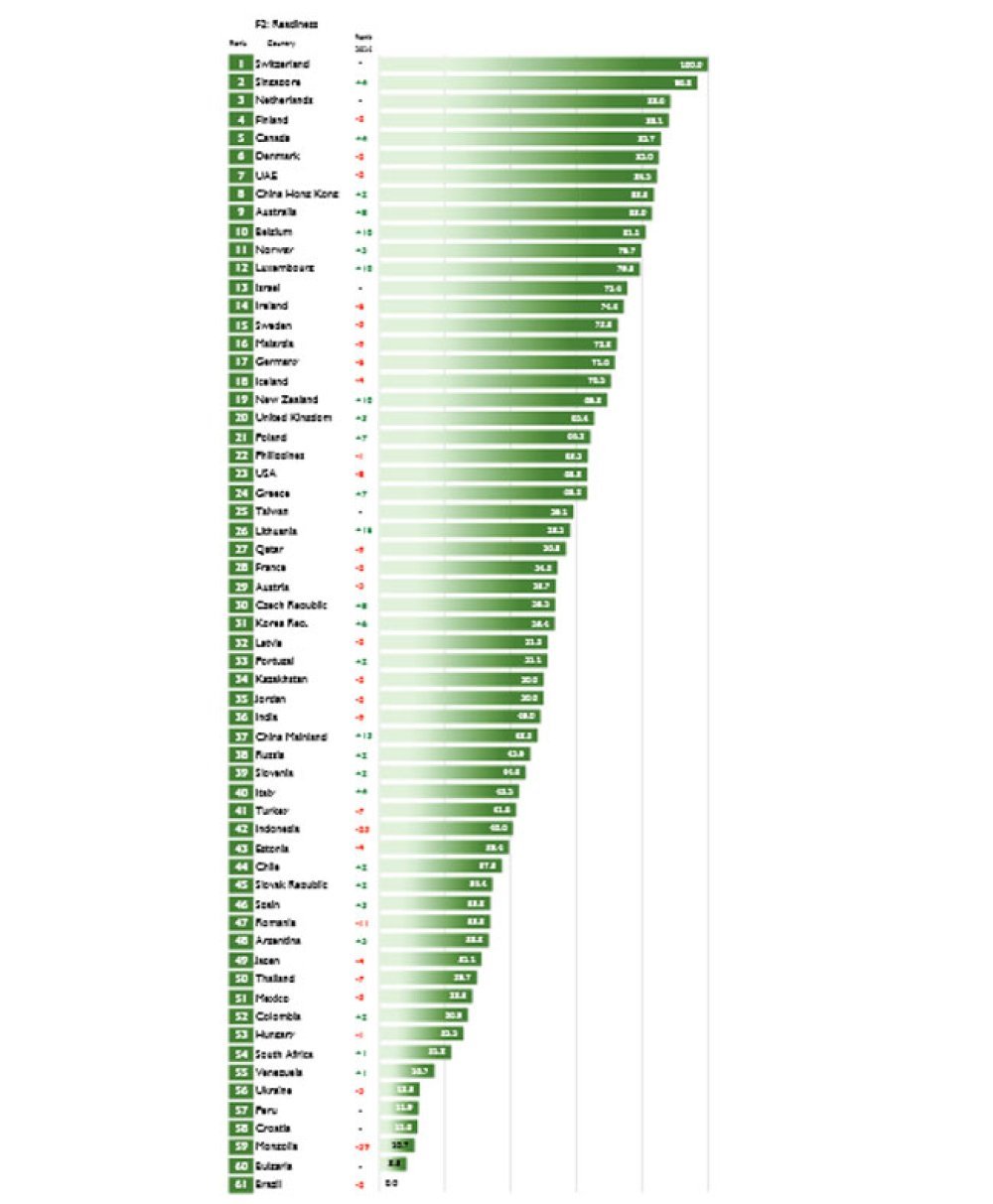 U 10 najuspješnijih dominiraju razvijene europske zemlje redom Švicarska, Danska, Luksemburg, Norveška, Nizozemska, Finska, Njemačka i Belgija. U ovu elitnu skupinu od neeuropskih zemalja uspjele su se probiti samo Kanada na osmom mjestu i Singapur na 10. Sjedinjene Države zauzele su 14. mjesto, a Slovenija 38. mjesto sa 34,9 od mogućih 100 poena.