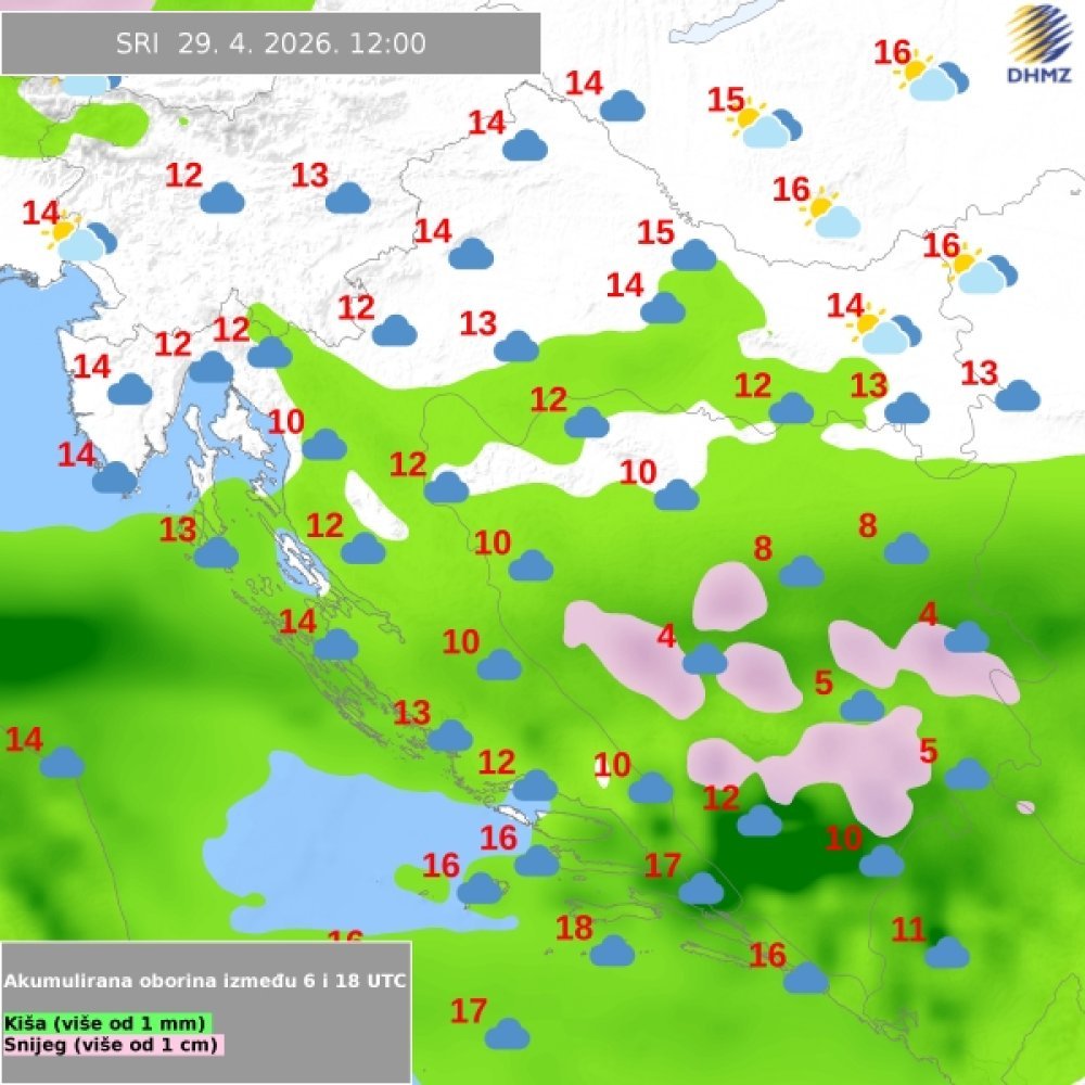 Na krajnjem jugu zemlje prevladavat će sunčano vrijeme uz povremene oblake. Bura će u početku biti jača, ponegdje i s olujnim udarima, ali će tijekom dana popustiti i zamijeniti je sjeverozapadnjak. Jutarnje temperature kretat će se od 8 do 13 °C, dok će dnevna dosezati oko 20 °C.