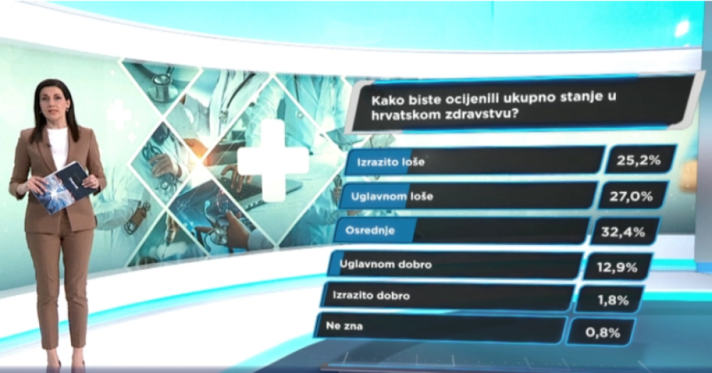 Na pitanje o najvećim problemima u zdravstvenom sustavu. Najviše ispitanih - 37,8 posto, smatra da su to liste čekanja na preglede i zahvate. Kao drugi problem istaknuli su lošu organizaciju i vođenje zdravstvenih ustanova, a s gotovo 14 posto slijedi manjak liječnika, medicinskih sestara i tehničara. Njih gotovo 11 posto smatra da su najveći problemi našeg zdravstva korupcija i nepotizam. Oko 5 posto smatra da su to rad liječnika u javnim i privatnim ustanovama, loša infrastruktura te potplaćenost zdravstvenih djelatnika, prenosi HRT