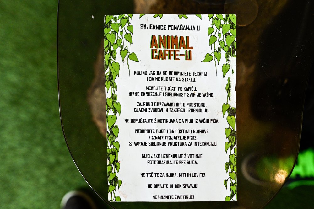 Zagrebački Animal Caffe svojim gostima nudi priliku da ispijaju kavu u društvu mačaka, papiga, ježeka, zmija i drugih gmazova. Vlasnik kafića, Amer Alaydi iz Jordana, pored pokazivanja nesvakidašnjih životinja o njima i educira znatiželjne posjetitelje. Pravila ponašanja pritom su jasno definirana uz glavnu poruku: ovo je njihov dom, a ljudi su samo gosti. Alaydi ističe da ljubav prema životinjama donosi i odgovornost, zbog čega odluku o njihovom udomljavanju, pogotovo onih egzotičnih, ne treba uzimati olako radi njihove dobrobiti