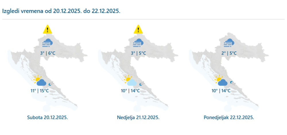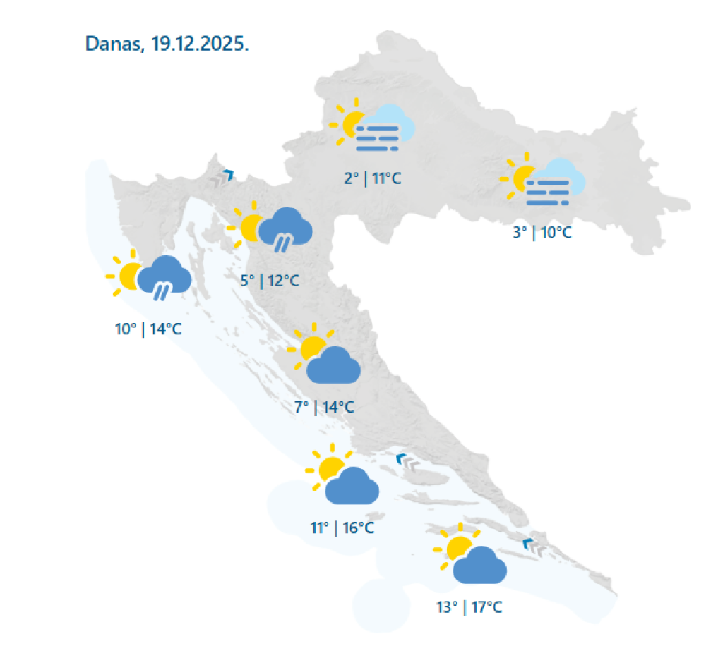 Toplije na zapadu Hrvatske, uz najvišu temperaturu zraka od 10 °C u Gorskoj Hrvatskoj do 15 °C na otocima sjevernog Jadrana. I pritom promjenjivo, gdjegod i pretežno oblačno. Mjestimice će biti kiše, ujutro i magle. Vjetar slab, rijetko gdje i umjeren jugozapadni i jugo.