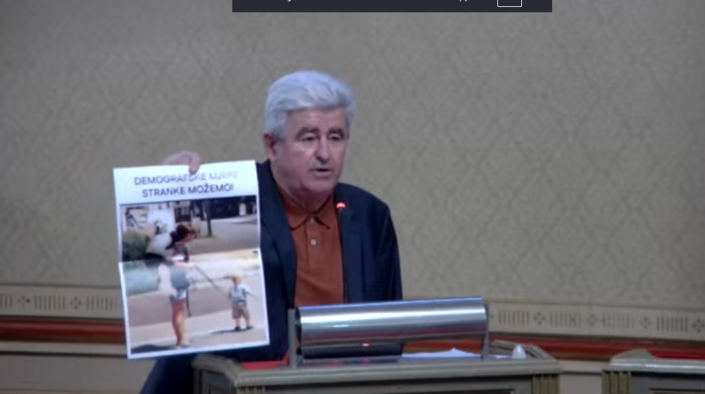 'Imam šokantnu fotografiju. Ovo su vaše demografske mjere u Zagrebu', kazao je Jelić, pokazavši plakat majke s dvoje djece, od kojih je jedno nosila na leđima, a drugo na lajni.