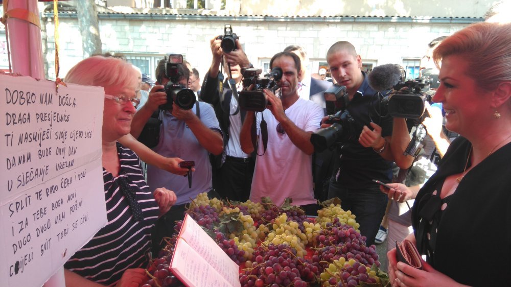 U pratnji cijele svite savjetnika, uključujući i onoga za nacionalnu sigurnost Josipa Buljevića, Grabar Kitarović uletjela je u gužvu na živopisnom splitskom pazaru i ondje punih pola sata obilazila štandove, kupovala breskve i smokve te se fotografirala s prodavačicama. Jedna od njih, Ana Filipović, čak ju je dočekala s izvješenom porukom dobrodošlice, da bi predsjednici potom pročitala podulju pjesmu napisanu posebno za nju.