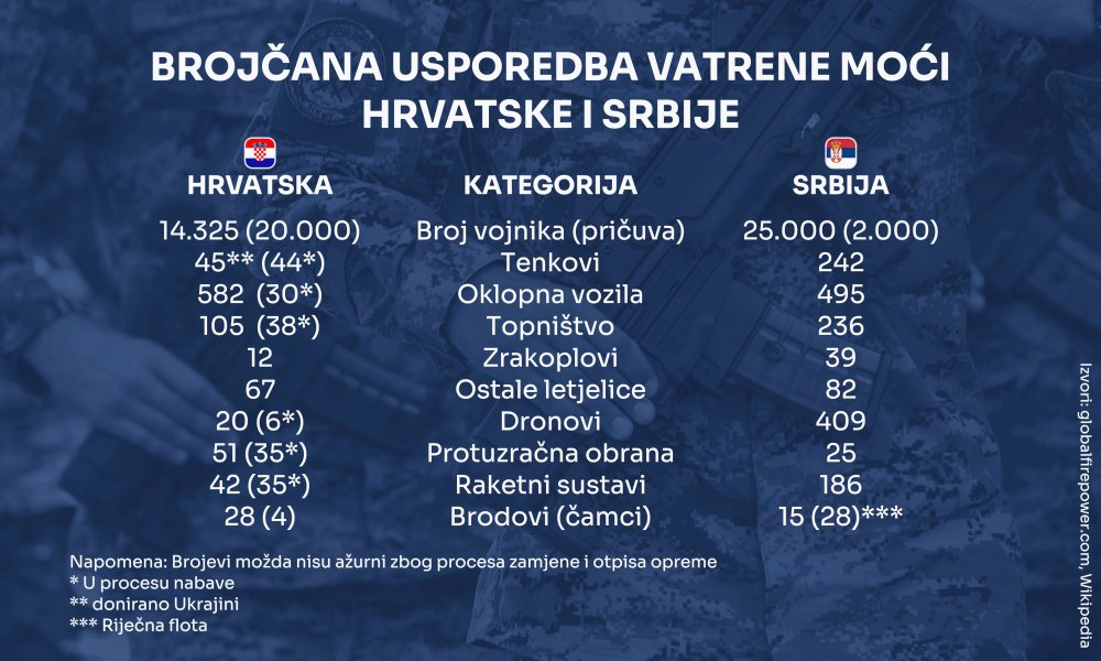 Brojni sukobi i geopolitičke trzavice nagnale su Europu da krene u naoružavanje. Vojske na Starom kontinentu ozbiljno se pojačavaju. U tom konktekstu, Global Firepower Index otkriva koje su zemlje u tome uspjele u većoj ili manjoj mjeri. Ta je analiza ustvrdila da je srpska vojska po broju vojnika i količini naoružanja jača od hrvatske. No, stručnjak za obranu Marinko Ogorec smatra da se prava snaga vojske procjenjuje po parametrima koji se ne mogu statistički mjeriti