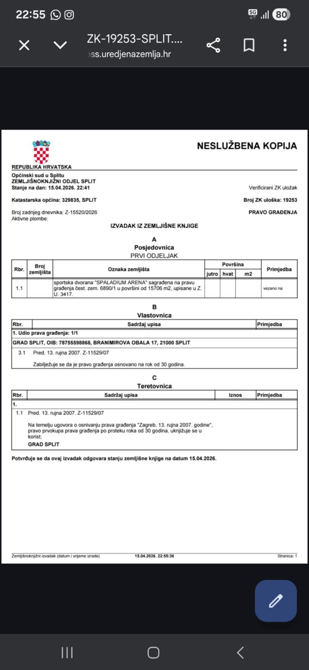 Spaladium arena, uz pravo građenja na parceli veličine 15.706 četvornih metara, od jučer je službeno uknjižena kao vlasništvo Splita, čime je završen jedan od najduljih, najkompliciranijih i najvrjednijih sporova u Hrvatskoj, a trajao je petnaest godina i službeno bio procijenjen na gotovo 120 milijuna eura