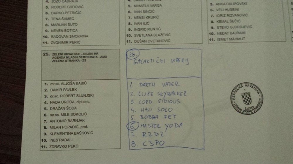 Obožavateljima 'Ratova zvijezda' očito ni Kukuriku koalicija, ni HDZ, ni Laburisti, pa ni Savez za Hrvatsku ili novoosnovani OraH nisu bili dovoljno privlačni, pa se tako na jednom glasačkom listiću našla nadopisana i 26. lista, ona pod nazivom 'Galaktički imperij'.