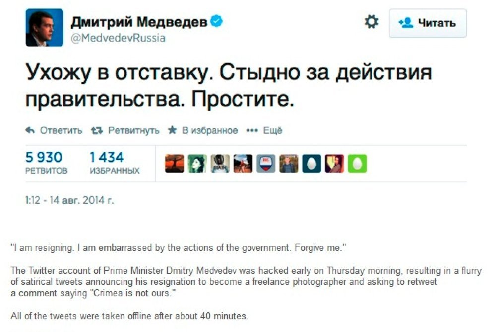 'Dajem ostavku. Stid me mojih postupaka na čelu vlade. Oprostite', glasio je jedna od osam poruka koje su hakeri između 10.15 i 11 sati po mjesnom vremenu objavili u ime ruskog premijera. U ostalima je poručio da Vova (nadimak ruskog predsjednika Vladimira Putina) griješi i da Krim nije ruski.