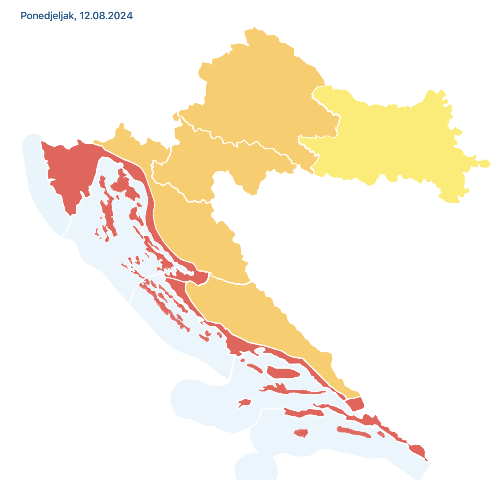 Za ostatak kolovoza ne očekuju se veće promjene vremena. Crveno upozorenje je izdano za cijelu obalu, a narednih dana neće biti olakšanja - očekuje se sunčano vrijeme s velikom opasnošću od toplinskog vala, posebno za osjetljive skupine poput starijih osoba i male djece. Aktivnosti treba prilagoditi vremenskim uvjetima.
