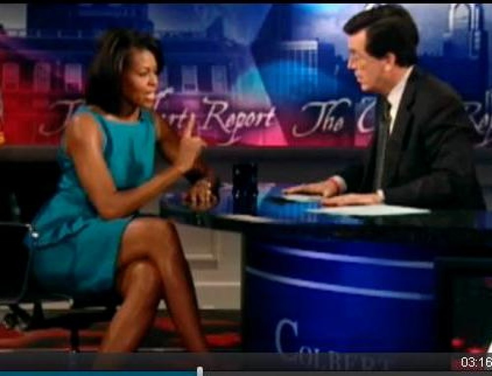 Stephen Colbert, jedinstveni voditelj popularnog 'Colbert Reporta' na američkoj TV postaji Comedy Central, ugostio je prvu damu SAD-a, Michelle Obamu. Prvo pitanje: Svi znaju da ste vi i vaš suprug 'elitisti'. Recite mi nešto o vašem elitnom odrastanju u južnom Chicagu. Koliko srebrnih žličica ste imali u ustima?