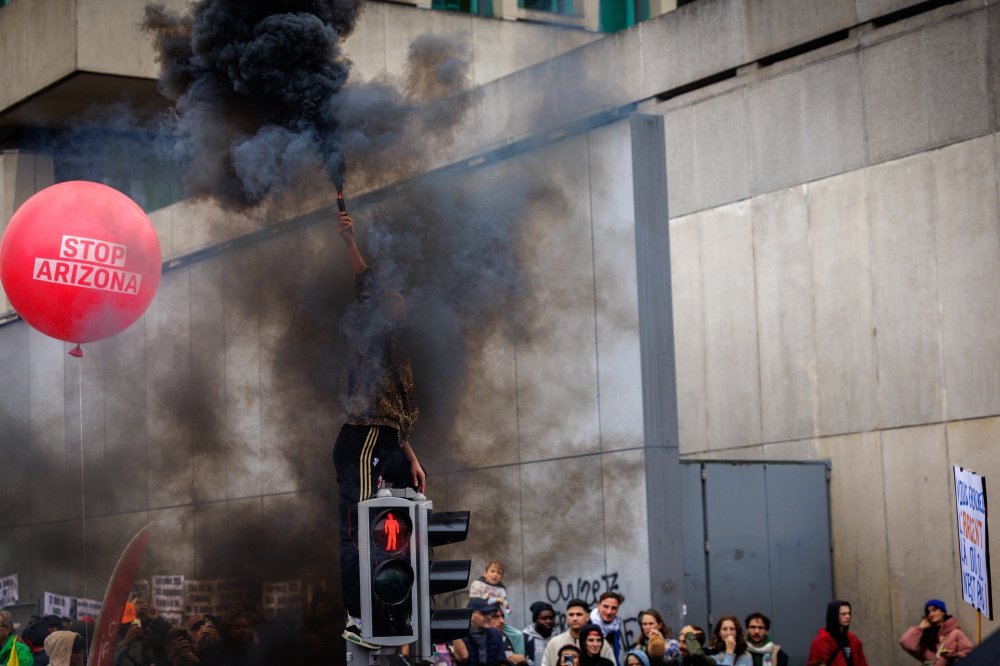Centrom Bruxellesa odjekivale su petarde, prosvjednici su palili kontejnere, a čule su se policijske sirene. Policijski helikopter nadlijetao je mjesta prosvjeda.